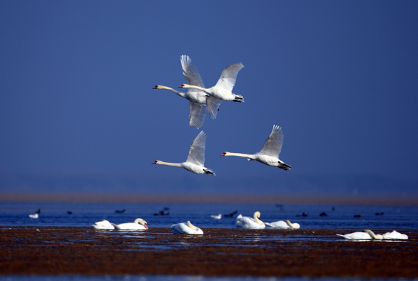 图为乌梁素海湖区内栖息的天鹅。(黄洪峰 摄)