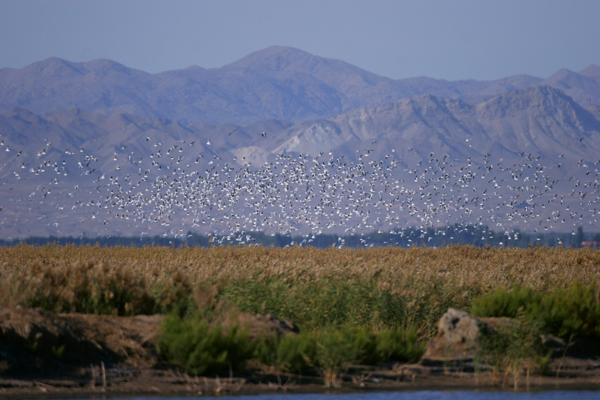 图为乌梁素海湖区苇林上空飞翔的各类飞鸟。(河套灌区管理总局提供图片)