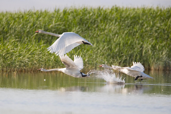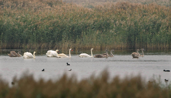 图为在苇林中栖息的天鹅。(河套灌区管理总局提供图片)
