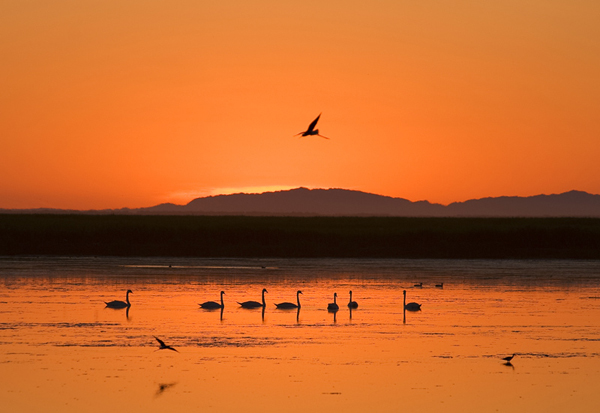 图为乌梁素海湖区内栖息的天鹅。(黄洪峰 摄)