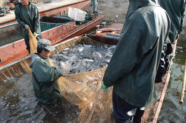 图为渔场工人捕捞湖鱼。(河套灌区管理总局提供图片)