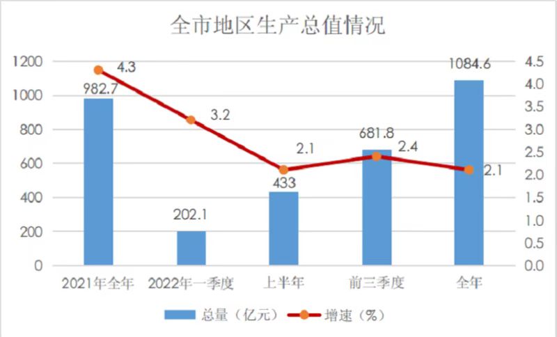 根据盟市生产总值统一核算结果,2022年,全市地区生产总值1084.6亿元,同比增长2.1%。从三次产业看,第一产业增加值293.5亿元,同比增长3.9%;第二产业增加值359.5亿元,同比下降0.1%;第三产业增加值431.5亿元,同比增长2.4%。一、三产业对经济的贡献率分别为49.1%和52.8%。