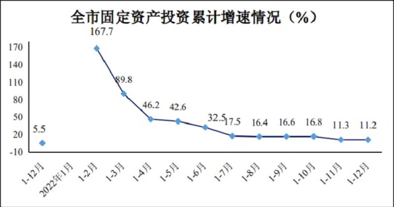 固定资产投资持续增长。2022年,全市固定资产投资同比增长11.2%。其中,第一产业投资同比增长35.6%,拉动投资增长3.7个百分点;第二产业投资同比增长69.5%,拉动投资增长24.4个百分点。从重大项目投资情况看,全市固定资产投资施工项目536个,其中亿元以上项目156个,累计完成投资同比增长72.4%,占全部投资的69.2%。从投资领域看,全市制造业投资同比增长6.4%;基础设施投资同比增长44.2%。从高质量领域投资看,高技术产业投资同比增长38.7%,其中,高技术制造业投资增长1.2倍。