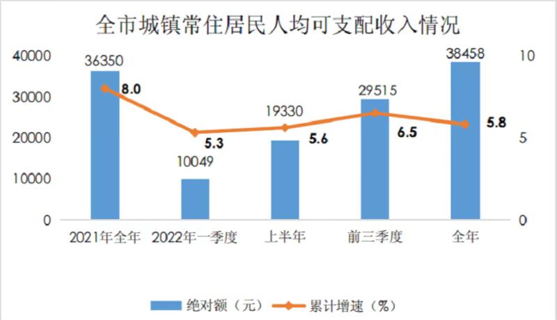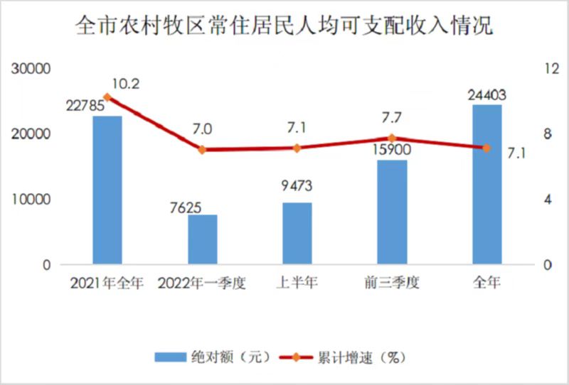 2022年,全市全体居民人均可支配收入32155元,同比增长6.3%,快于地区生产总值增速4.2个百分点。从季度看,一季度同比增长6.3%,上半年同比增长7.0%,前三季度同比增长7.1%。从城乡看,城镇常住居民人均可支配收入38458元,同比增长5.8%;农村牧区常住居民人均可支配收入24403元,同比增长7.1%。农村牧区常住居民人均可支配收入增速快于城镇居民收入1.3个百分点,城乡居民收入比由2021年的1.60缩小至1.58。